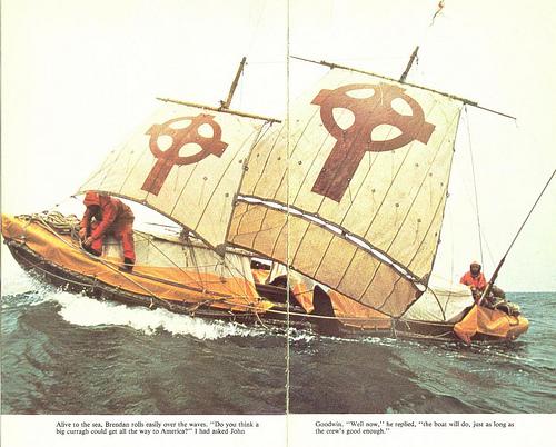 The Brendan, a 36-foot, two masted boat was built in traditional fashion of Irish ash and oak, hand-lashed together with nearly two miles (3 km) of leather thong, wrapped with 49 tanned ox hides, and sealed with wool grease. Between May 1976 and June 1977, Tim Severin and his crew sailed the Brendan 4,500 miles (7,200 km) from Ireland to Peckford Island, Newfoundland, stopping at the Hebrides and Iceland en route. [Wikipedia]