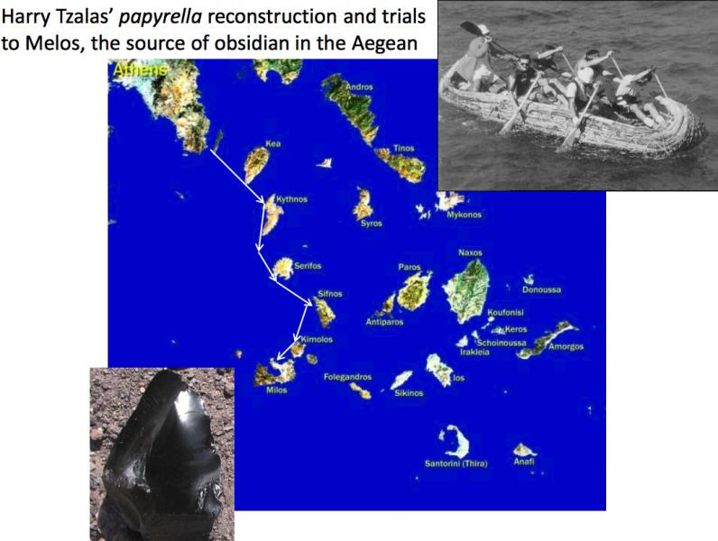 Island settlement implies some navigation legs over 100km in very primitive craft. There is also evidence of repeated trade (in obsidian) between some islands and the mainland. In recent years, experimental archeologists have repeated these voyages in bith reed craft and dugout canoes.