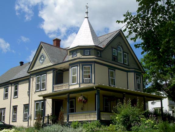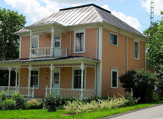 (photos Patrice Marcotte, 8 août 2002 (gauche) et 17 juillet 2007 (droite)) Charles Ulric R. Tartre, notaire, épouse en seconde noce une demoiselle Gendron, fille d'une des premières familles canadiennes-françaises à s'établir à Sutton. Maire de Sutton de 1929 à 1936, il fait rénover le système d'aqueduc après le terrible incendie de 1898. Construite dans le style Queen Ann, le bardeau en écaille du mur-pignon de la demeure est percé d'une serlienne et la corniche est prolongée par un oriel pendant. À son fa¸ite, la tourelle conique est munie d'un socle. Cet étalage de formes sur le toit est assagi plus bas par des fenêtres à linteaux bas, exception faite du losange. |