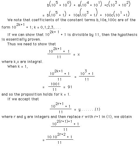In the first, second, and third columns we have values of a,b,and c. In the fourth column we have the palindromes formed by using the relationship above and in the fifth column we have the results obtained when we divide the palindromes by 11. Note that we have an integral answer every time.