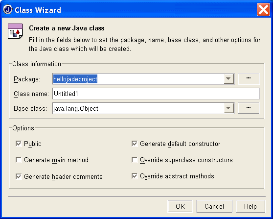 Note that by default, JBuilder suggests a package name which is the same as the project name you chose, but all lower case. You can accept this but maybe you wish to change it. Suppose we want to follow the other JADE examples and name this package, examples.helloworld. Type this into the package field.