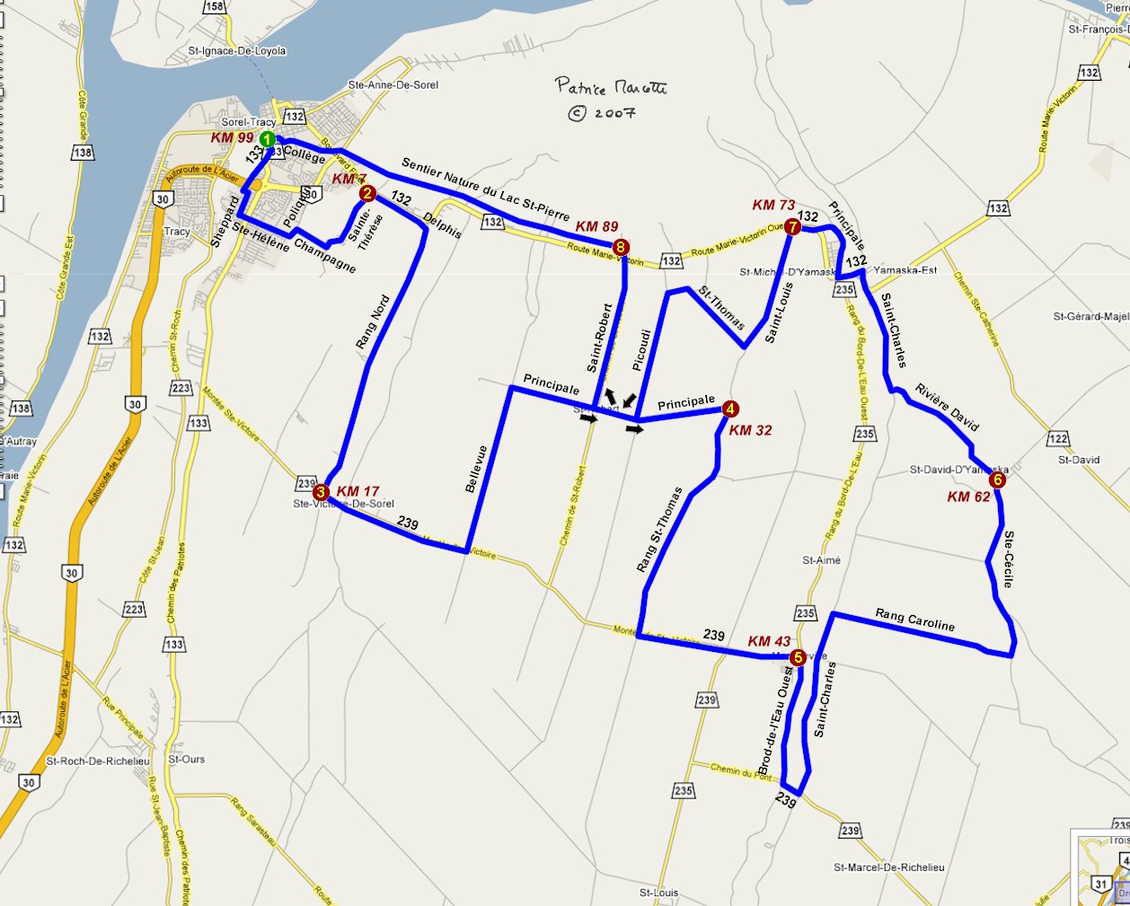 Les parcours suivants empruntent des routes pavées, à de rarissimes exceptions, et alors pour pas bien longtemps. Ils devraient donc être appréciés des rouleurs, sans pour autant négliger l'aspect sécuritaire. L'hyperlien «Pedometer» permet de visualiser le trajet sur «Google maps» et d'avoir accès à toutes les fonctionnalités de ce logiciel: distances parcourue, image satellite, élévation, zoom. Pour des détails supplémentaires, se référer aux descriptions des sites traditionnels correspondants (avant-dernière colonne), à partir desquelles de nombreuses autres combinaisons sont possibles. Noter enfin que le Richelieu divise les Montérégie est et ouest NOTES IMPORTANTES