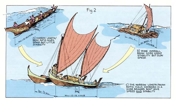 Over time, this basic design would evolve in various ways: adding sails for speed and using a platform over two full canoes to allow migrating groups to travel for weeks out of sight of land and settle distant islands.